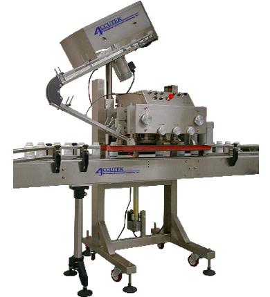 The next packaging machine in the process secures a closure (cap) on a container. Caps are bulk loaded into a hopper where they are oriented and organized to be picked up by a container just before being screwed on, pressed on, snapped on, or stomped.