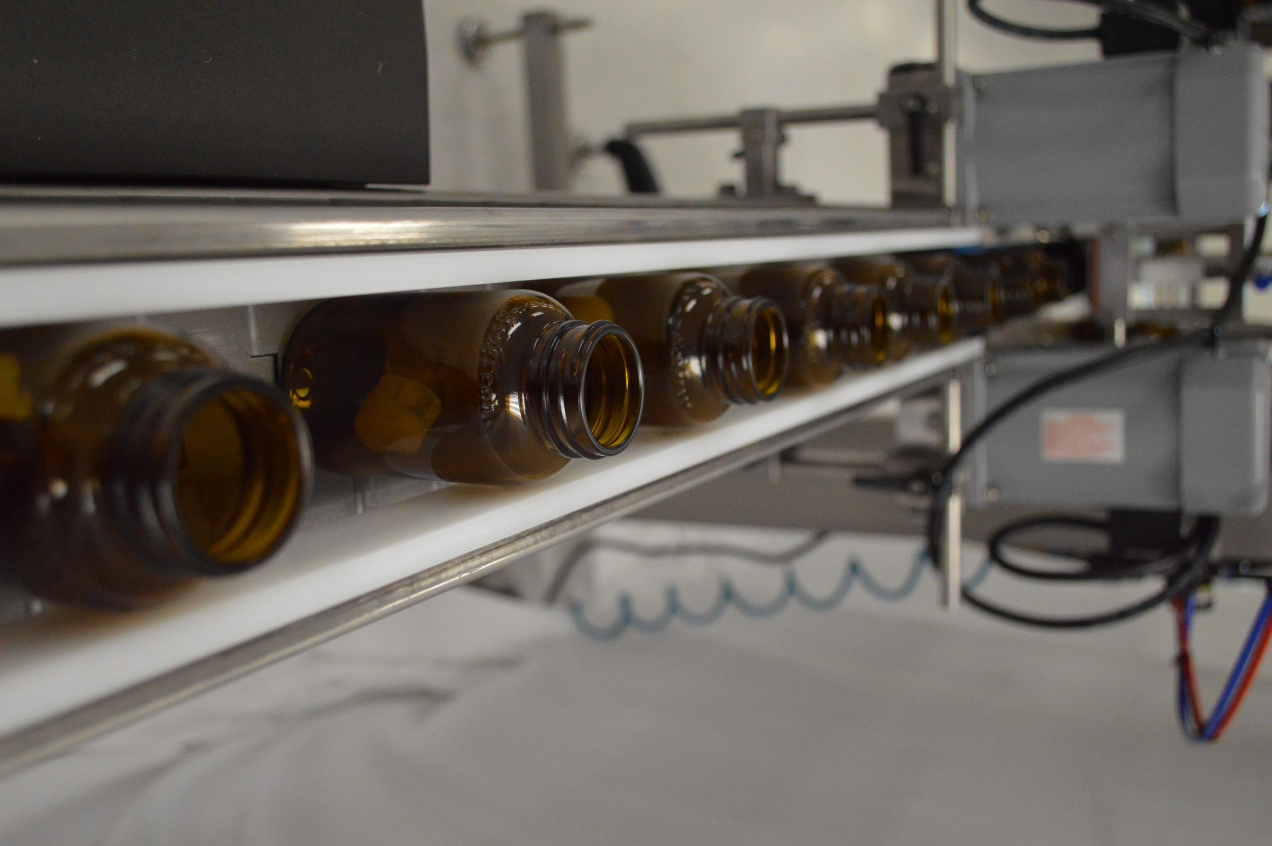 Automatic Desiccant Inserter features a pneumatic stomp assembly. The conveyor moves the barrels under the chute. The bottle opening strips a barrel from the chute as it passes under the chute. The bottle sensor sees the bottle and fires the stomper. The stomper presses the desiccant barrel into the bottle.