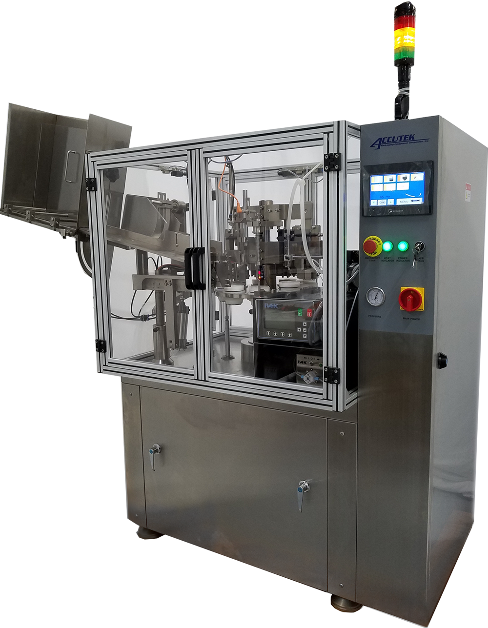 The TFS-1PT Tube Filler Sealers machines are heavy duty stainless steel fillers suitable for filling all kinds of semi-viscous and viscous products into plastic tubes. Plastic tubes are then internally heated and can be embossed with an optional date and lot number coder. The TFS machines are great for use in the pharmaceutical, food, cosmetic and chemical industries. Tube feeding, marking identification, filling, folding or sealing, code printing, and finished product output are all conducted by a fully automated touch screen control system with help menus. The TFS tube filler sealers offer quick and easy adjustment, making these machines simple to operate and maintain.